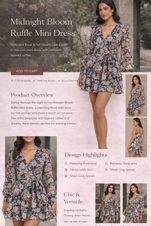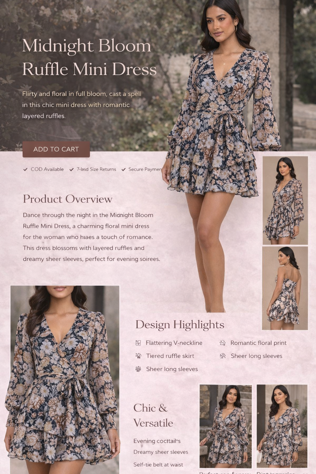 Effortlessly feminine with a touch of drama, the Midnight Bloom Ruffle Mini Dress is designed to stand out. Featuring a rich floral print on a dark base, this dress combines a flattering wrap-style bodice with layered ruffle detailing for a playful yet refined silhouette.