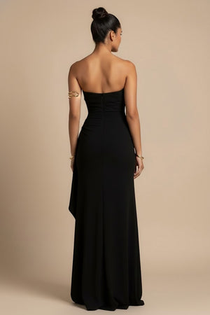 Turn heads with effortless elegance in the Midnight Muse Strapless Slit Gown. Designed to sculpt and flatter, this timeless black gown features a sleek strapless neckline paired with soft draping that cinches the waist and flows gracefully into a dramatic thigh-high slit. Perfect for evenings that call for understated glamour, this piece blends modern minimalism with bold femininity.