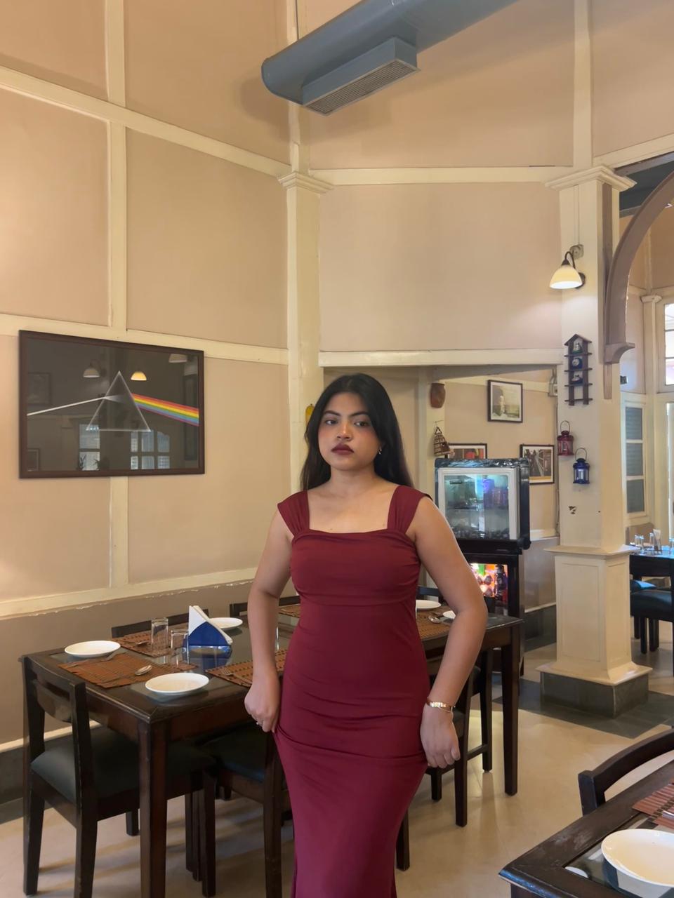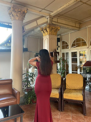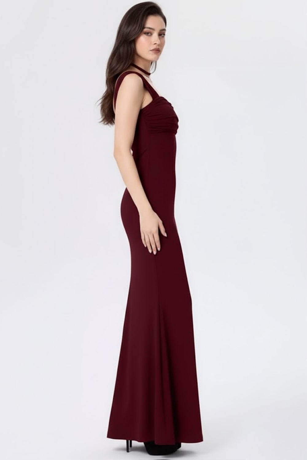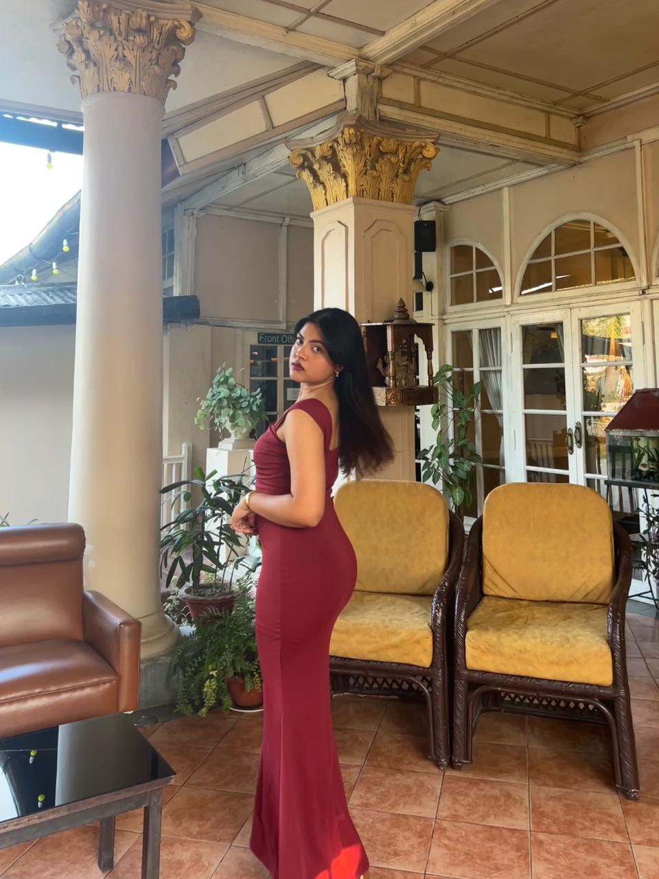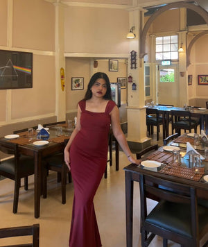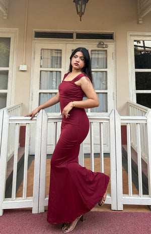 Tailored to skim the body, the dress flows seamlessly into a floor-length hem, elongating the silhouette and creating a statuesque finish. Whether styled with statement heels or delicate accessories, this piece is designed to make an impact without trying too hard.