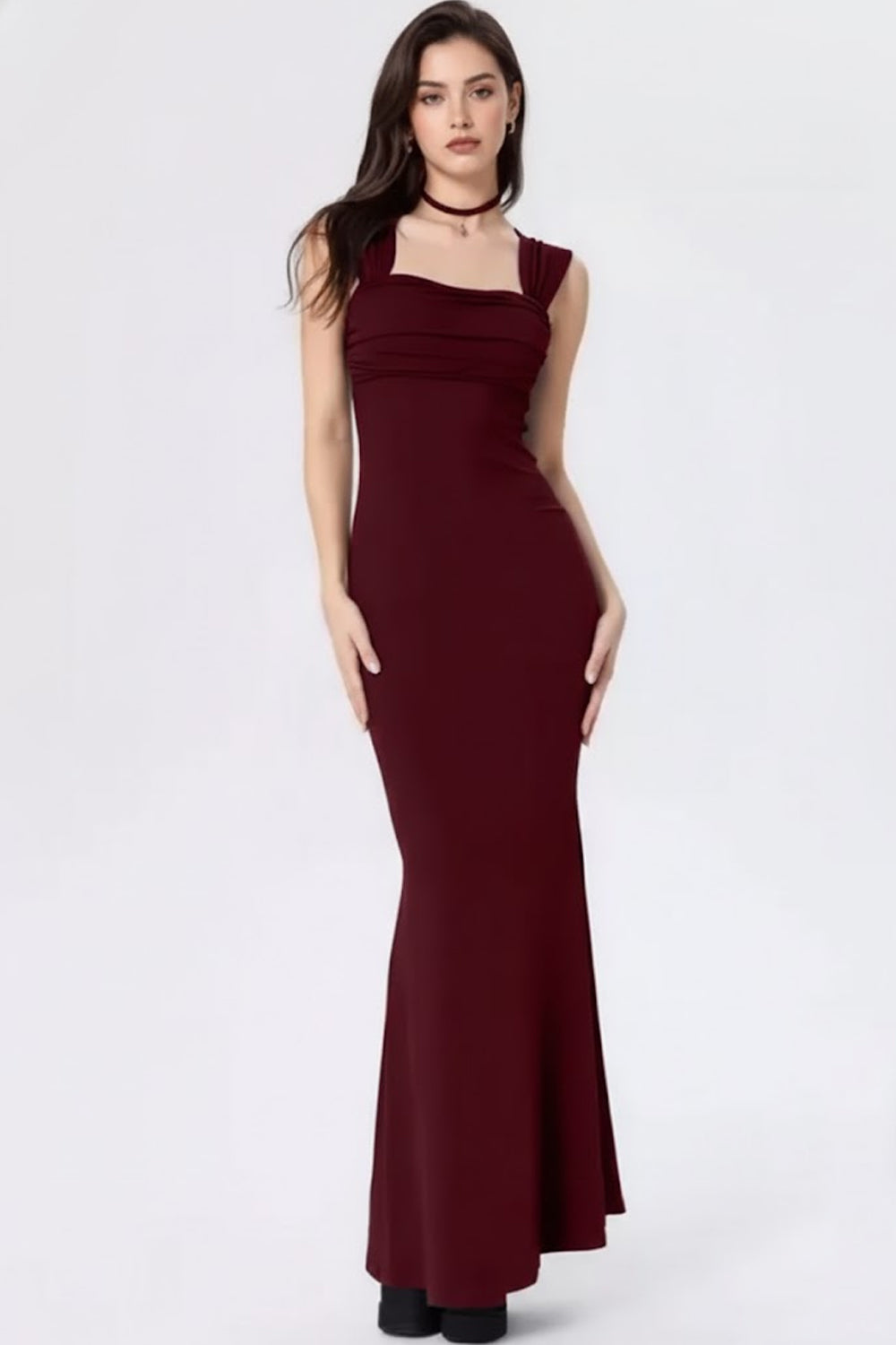 The dress features a structured square neckline with softly ruched detailing at the bust, adding depth and a flattering lift. Wide shoulder straps provide support while creating a clean, sophisticated frame, and the low scoop back adds just the right touch of allure.