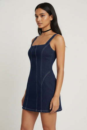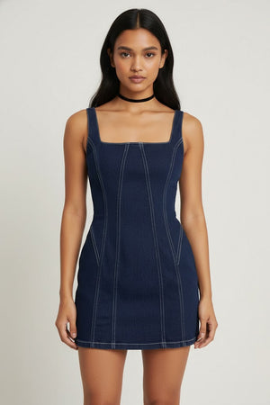 | Product Description | Mini dress with a square neckline, wide supportive shoulder straps, and prominent contrast stitching that details the bodice seams, giving a panelled or corset-like effect. |