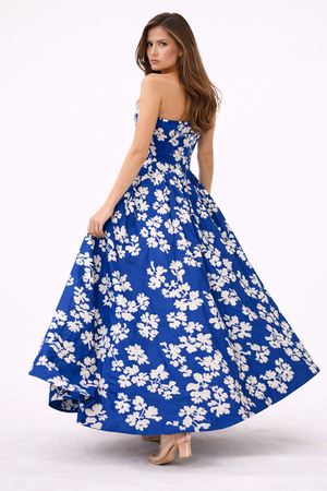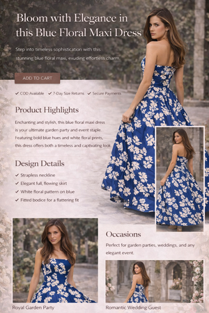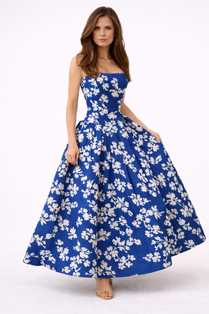 | Product Description | Floral Corset-Style Maxi Dress a structured corset-style bodice with thin spaghetti straps and a sweetheart neckline. The dress is adorned with a delicate vintage-inspired floral print. It includes a cinched waist that flows into a voluminous, pleated maxi skirt. |