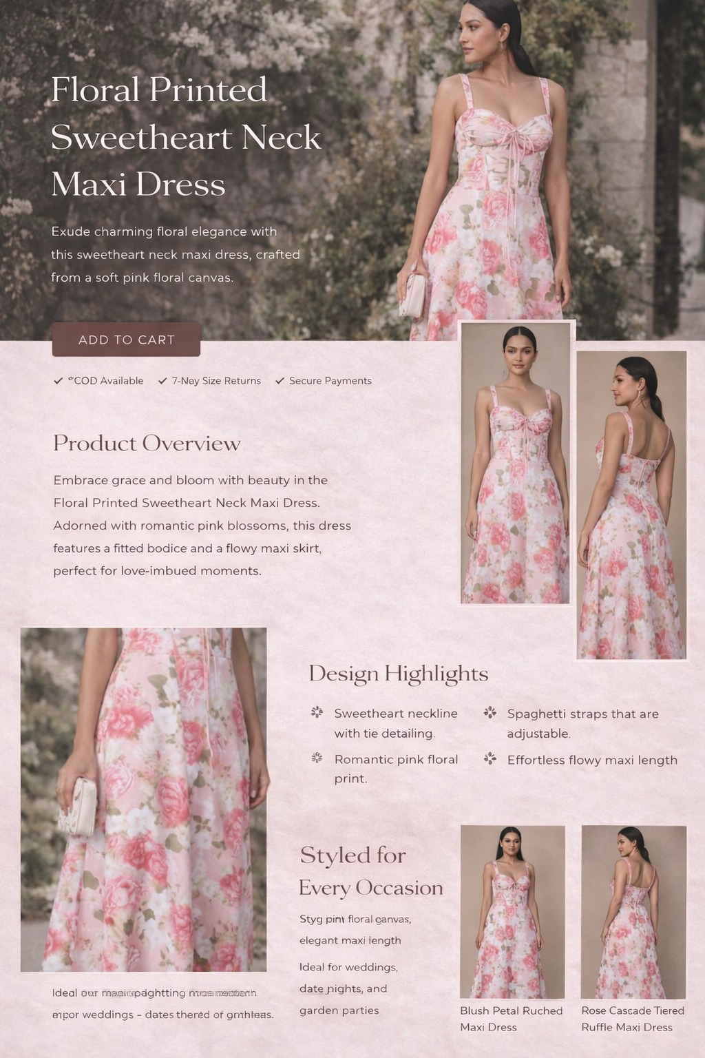 Romantic, graceful, and effortlessly elegant — this floral maxi dress is designed to bring soft femininity to every occasion. Set against a delicate blush-pink base, the all-over floral print creates a timeless, dreamy appeal that feels both fresh and refined.