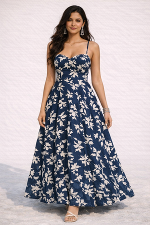 The soft, flowing silhouette moves beautifully with every step, while the delicate shoulder straps and sculpted bodice create a flattering, feminine shape that feels both effortless and elevated. The white floral narrative across the dress acts as the hero visual — instantly memorable, instantly iconic.