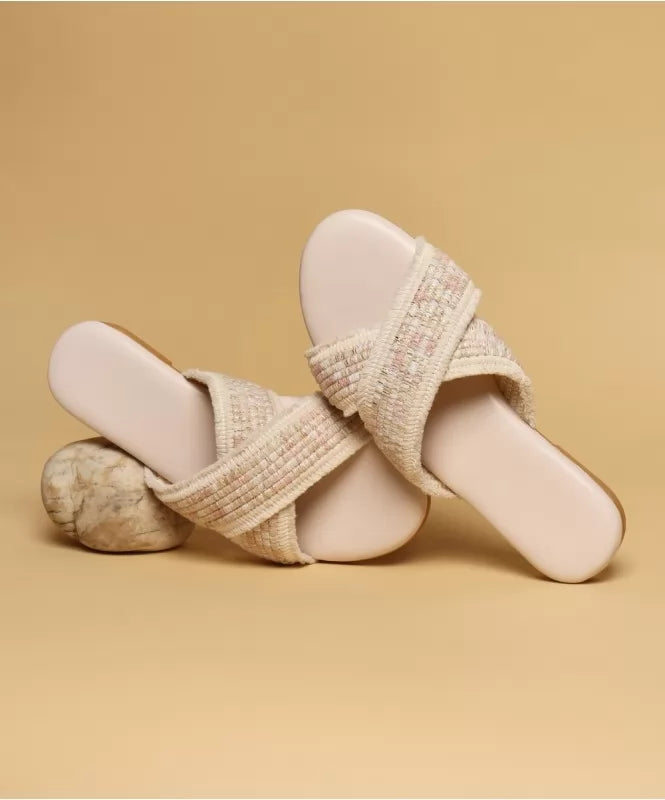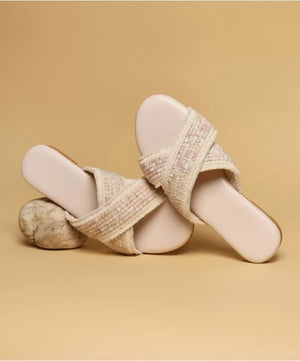 Effortlessly elegant with a touch of artisanal charm, these Ivory Handwoven Cross-Strap Flats are designed for women who appreciate understated luxury. Featuring delicately woven cross straps in a soft ivory palette, this pair blends texture, comfort, and sophistication. The minimal silhouette makes it a versatile staple—perfect for everyday elegance, relaxed brunches, or serene festive looks.