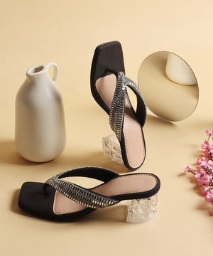 Sculpted for elegance and finished with artisanal finesse, the Midnight Knot Crystal Heeled Slides embody modern luxury with a couture sensibility. Set on a sleek black base, the spotlight rests on the intricately hand-woven knot detail, delicately embellished with micro crystals that shimmer subtly under light.