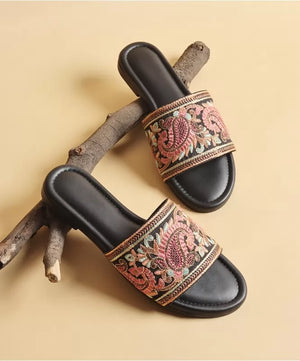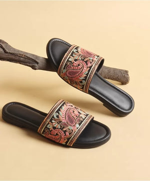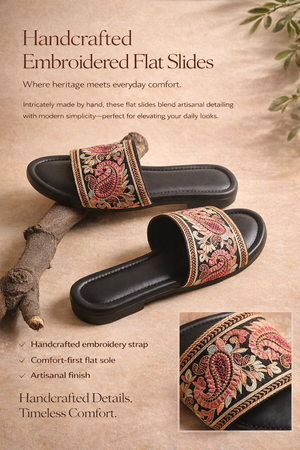 A bold expression of heritage artistry and modern ease, the Midnight Paisley Embroidered Slides are designed to make a statement. Set on a deep black base, the richly embroidered paisley motif brings together warm rust, soft blush, and muted green tones—creating a striking contrast that feels both timeless and elevated.