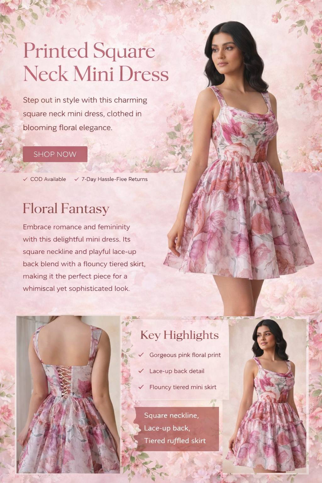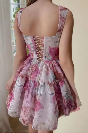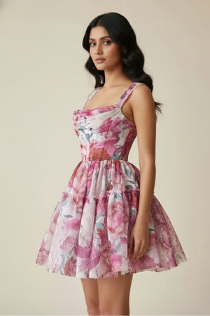 | Product Description | Floral Print Mini Dress a large, romantic floral print on a georgette like fabric. It has a structured bodice with a subtle cowl or draped square neckline, thick shoulder straps, and a voluminous, tiered, and flared skirt. |