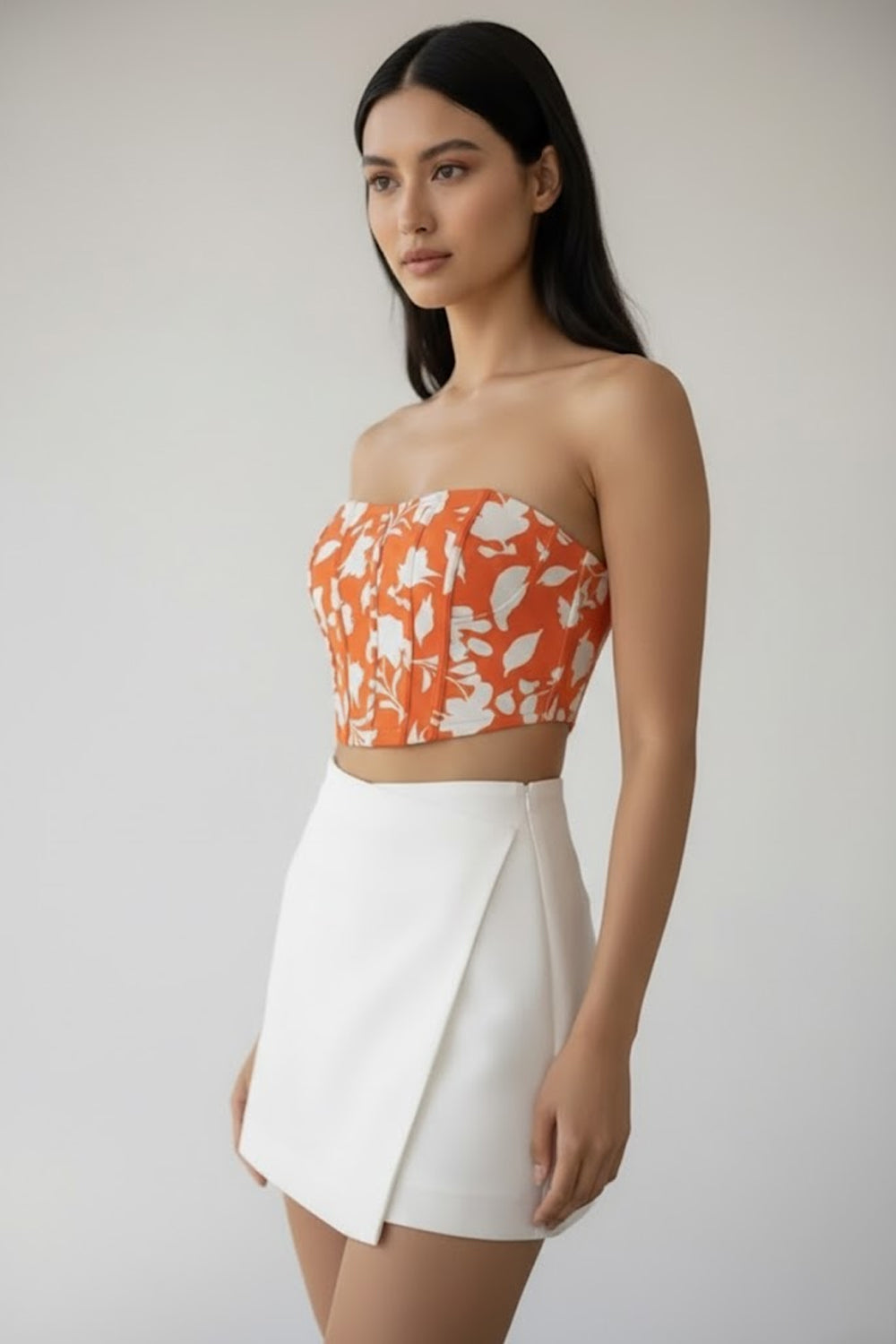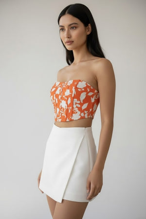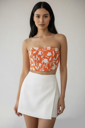 | Product Description | Top: a vibrant burnt orange or terracotta background with a contrasting white floral/botanical print. It is designed as a structured, strapless corset-style bodice with prominent vertical boning seams for shaping and a cropped length. Skirt: A pure white, high-waisted mini skirt with a stylish overlapping or asymmetrical wrap design at the front. |