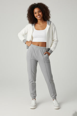 Product Description Top (Hoodie): Cropped Length, Full front zip. Color-Block design where the main body is White, and the hood lining, cuffs, and hem are Heather Grey.