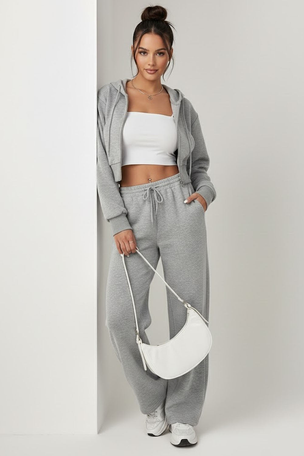 Set of 2-: Grey Cropped Hoodie & Wide-Leg Trouser For Women