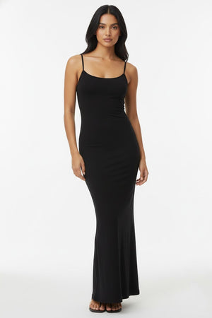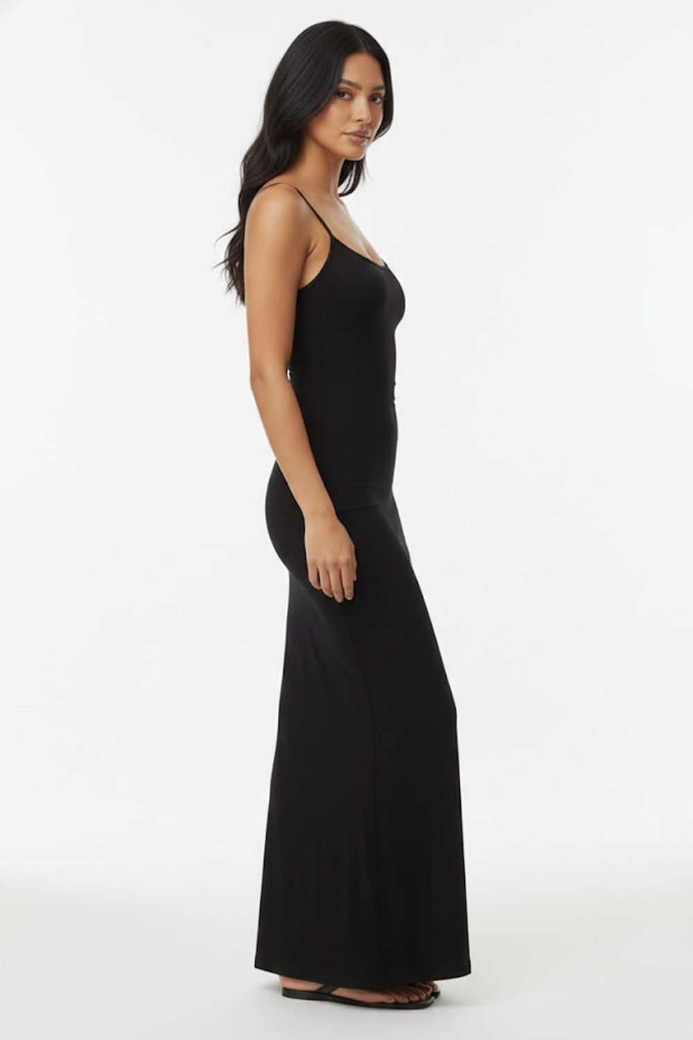 The delicate spaghetti straps and softly curved neckline lend a refined femininity, while the figure-hugging fit accentuates natural curves without feeling restrictive. The full-length hemline adds elegance, making this dress equally suited for evening occasions, formal dinners, or elevated daywear when styled thoughtfully.