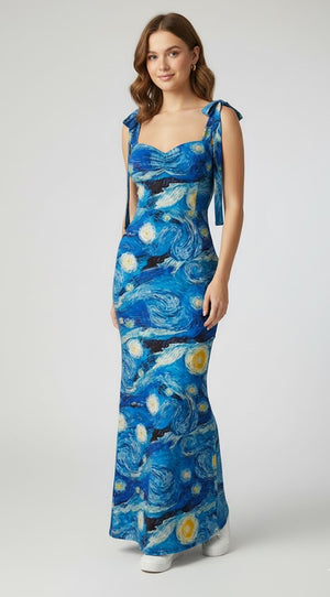 | Product Description | Maxi Dress with Art Print and Tie Strapsan artistic, all-over print inspired by Vincent van Gogh's The Starry Night. Includes a sweetheart neckline, ruching/gathered detail at the bust, and self-tie shoulder straps for an adjustable fit. The dress has a sleek, floor-length shape. |