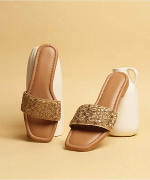 A celebration of traditional artistry and modern refinement, the Sundara Handcrafted Gold-Embellished Slides are designed to add quiet opulence to every step. Featuring an intricately handworked strap adorned with delicate circular embroidery and subtle gold accents, this pair reflects the beauty of slow craftsmanship and timeless design.